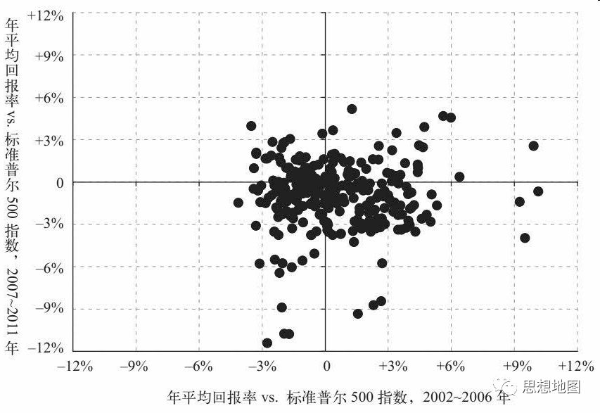 3.多数基金也不靠谱。2017年中国75%基金跑输指数,美国这个数字是88%。研究显示2002-2006,及2007-2011两个5年,美国几百个基金的表现,前后两个5年完全不相关(见下图)。选基金的难度一点都不比选股票小,甚至更大。基金最大的问题,一是手续费,二是基金管理费,三是亏钱了大不了不拿提成,赚钱就拿提成,导致基金管理人员主要是从自己的提成考虑,而非从客户的金钱收益考虑。
